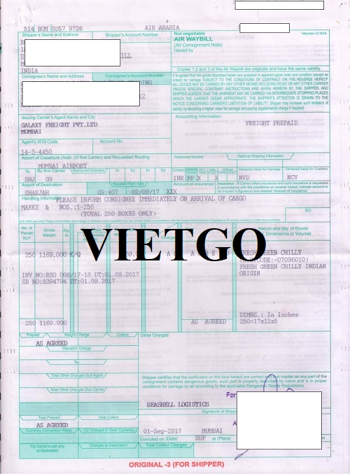 Hình ảnh bản vận đơn hàng không nhập khẩu ớt xanh