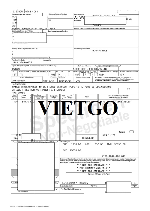Dưới đây là hình ảnh hai bản vận đơn hàng không nhập khẩu trái cây và rau củ từ Ấn Độ sang Hà Lan vào ngày 15/09/2017 và ớt xanh từ Ấn Độ sang Dubai vào ngày 01/09/2017 của công ty vị khách hàng: