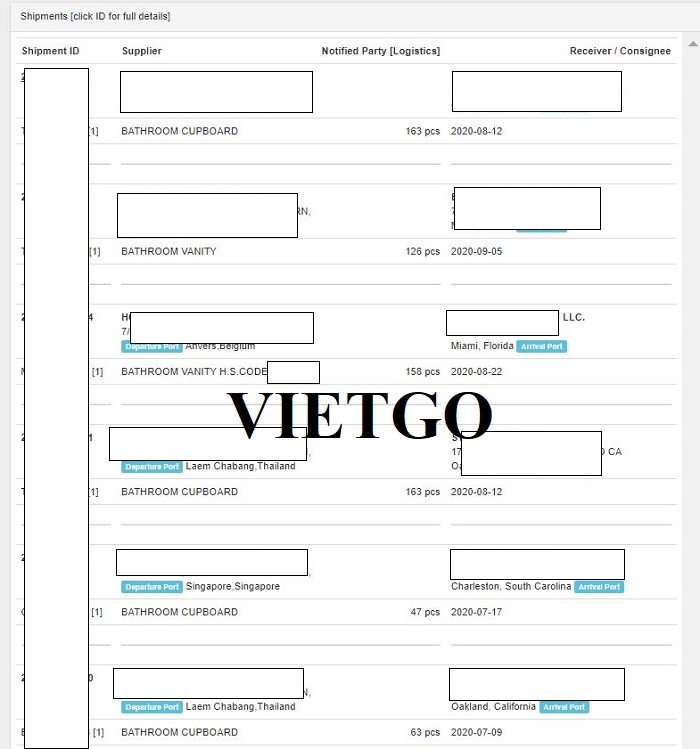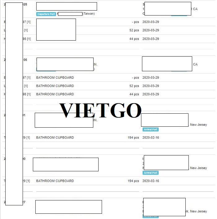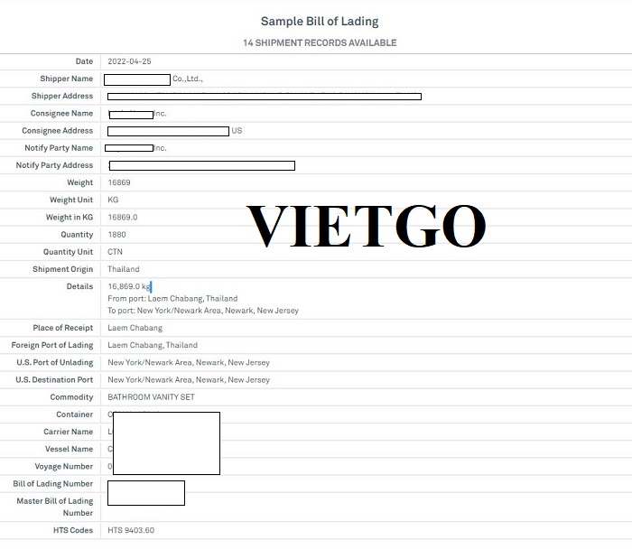 Hình ảnh thông tin vận đơn xuất khẩu thiết bị vệ sinh sang Mỹ vào ngày 25 tháng 04 năm 2022