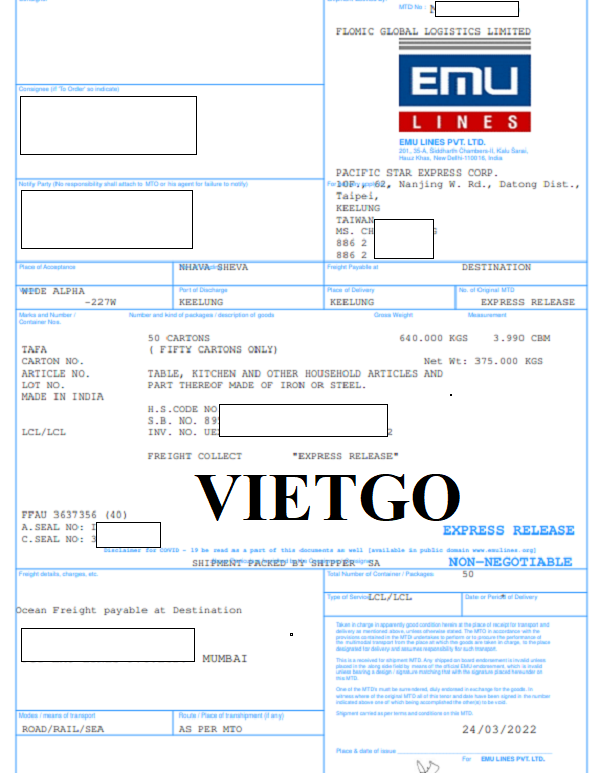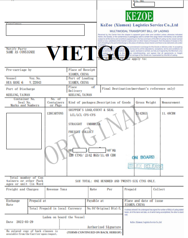 Dưới đây là hình ảnh vận đơn nhập khẩu hàng gia dụng và ô do công ty của vị khách hàng thực hiện thành công trong tháng 03 năm 2022: