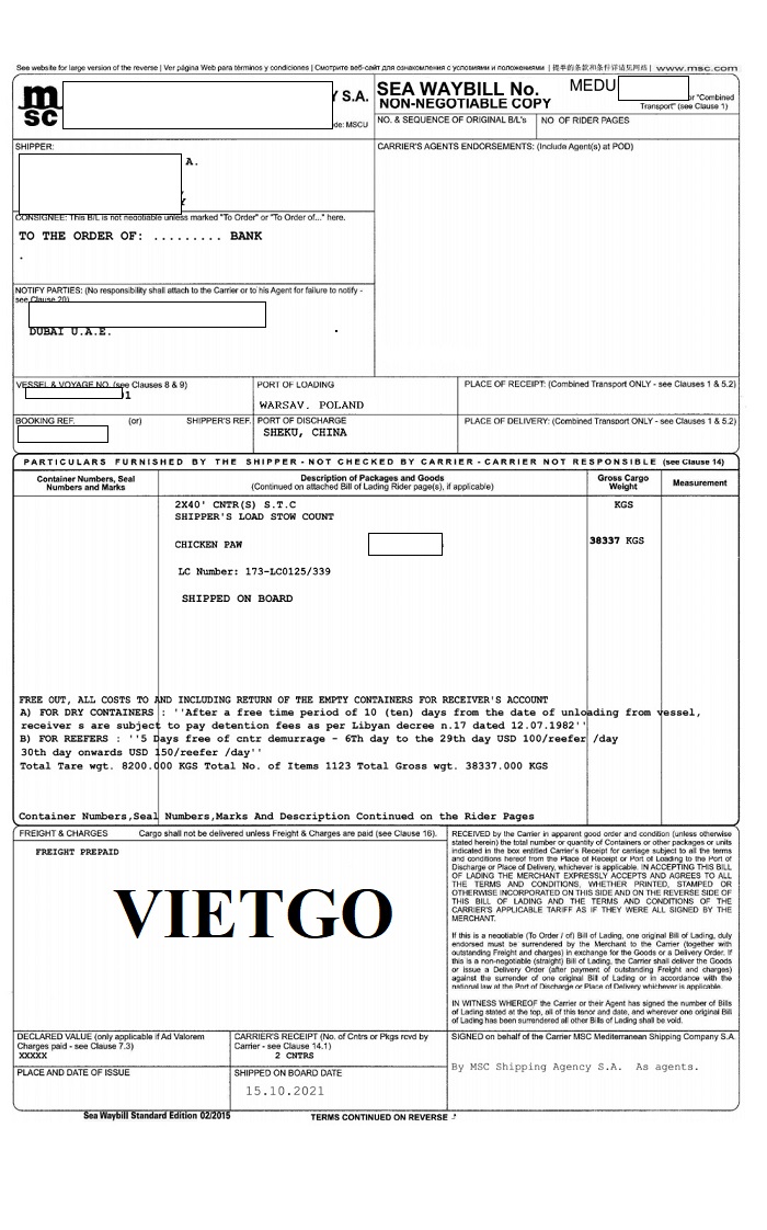 Dưới đây là hình ảnh bản vận đơn nhập khẩu chân gà từ Ba Lan vào Trung Quốc ngày 15/10/2021 của công ty do vị khách hàng đại diện: