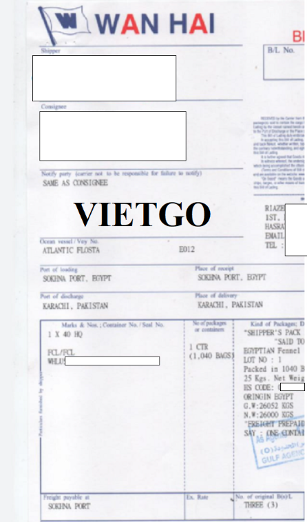 Hình ảnh bản vận đơn nhập khẩu hạt tiêu đen từ Ai Cập của công ty vị khách hàng