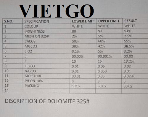 Ông Somil – đại diện đến từ Ấn Độ, vừa qua đã liên hệ với VIETGO trao đổi về mong muốn tìm kiếm nhà cung cấp cho đơn hàng nhập khẩu 100 tấn bột dolomite để phục vụ cho hoạt động kinh doanh của công ty ông. Vị khách hàng đã gửi thông tin chi tiết đơn hàng và đang rất nóng lòng nhận được báo giá từ nhà cung cấp để có thể thực hiện đơn hàng trong thời gian sớm nhất.