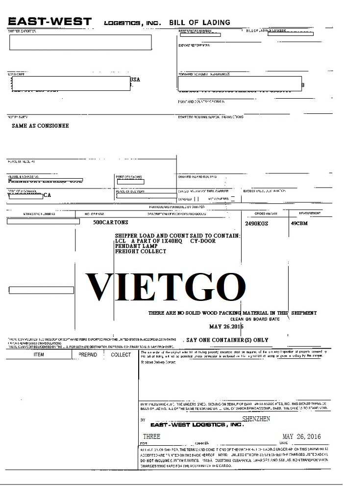 Dưới đây là vận đơn của chuyến hàng nhập khẩu đồ nội thất từ cảng Diêm Điền (Trung Quốc) sang cảng Vancouver (Mỹ) mà công ty của cô đã thực hiện thành công vào ngày 26 tháng 05 năm 2015: