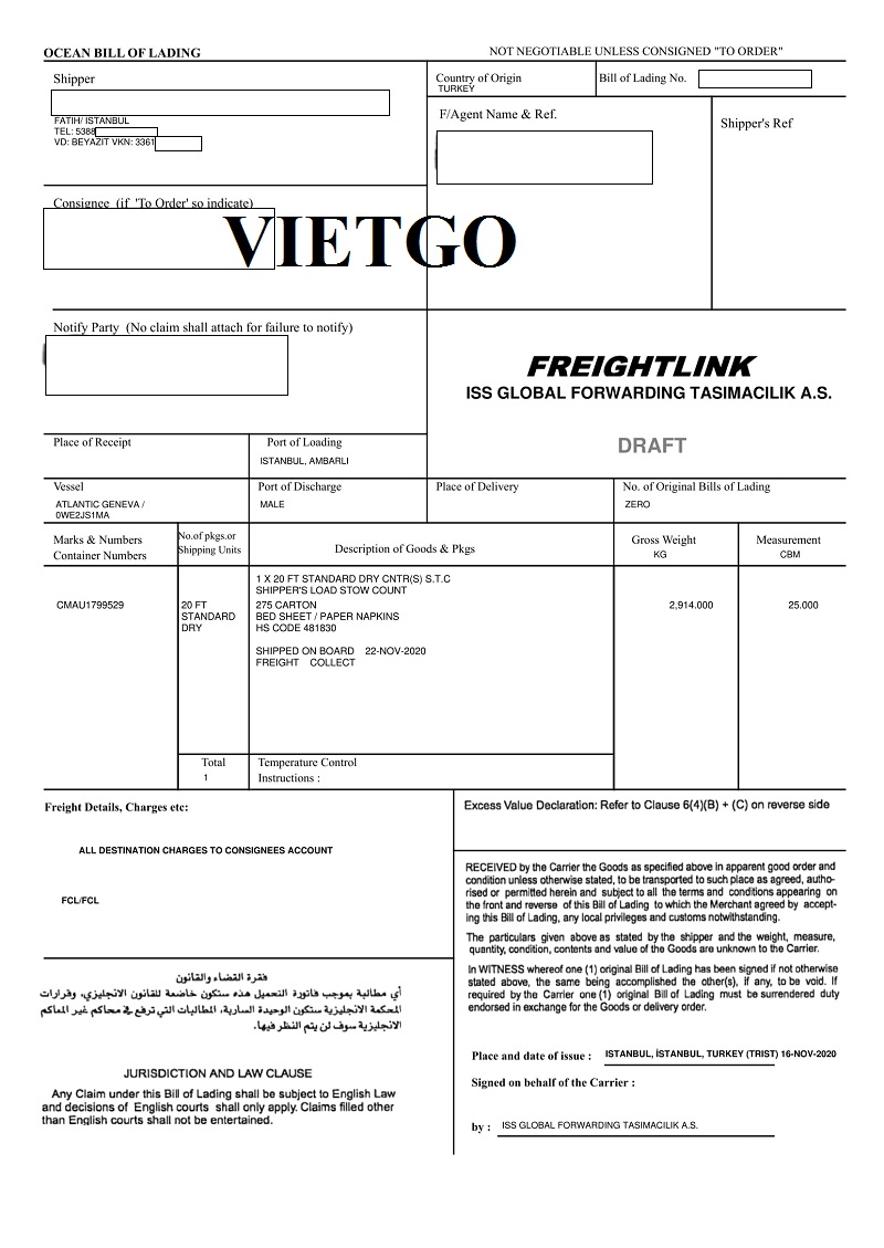 Dưới đây là hình ảnh một vận đơn đường biển (Bill of Lading) của một chuyến hàng xuất khẩu thành công ga trải giường và giấy ăn sang thị trường Maldives vào tháng 11 năm 2020 của công ty vị khách hàng.