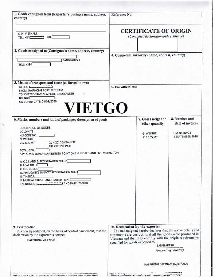 Hình ảnh chứng nhận nguồn gốc xuất xứ cho lô hàng nhập dolomite vào ngày 04 tháng 09 năm 2020