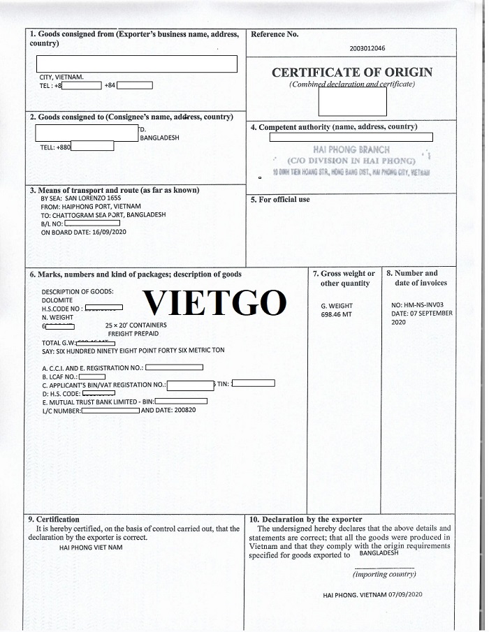 Hình ảnh chứng nhận nguồn gốc xuất xứ cho lô hàng nhập dolomite vào ngày 16 tháng 09 năm 2020