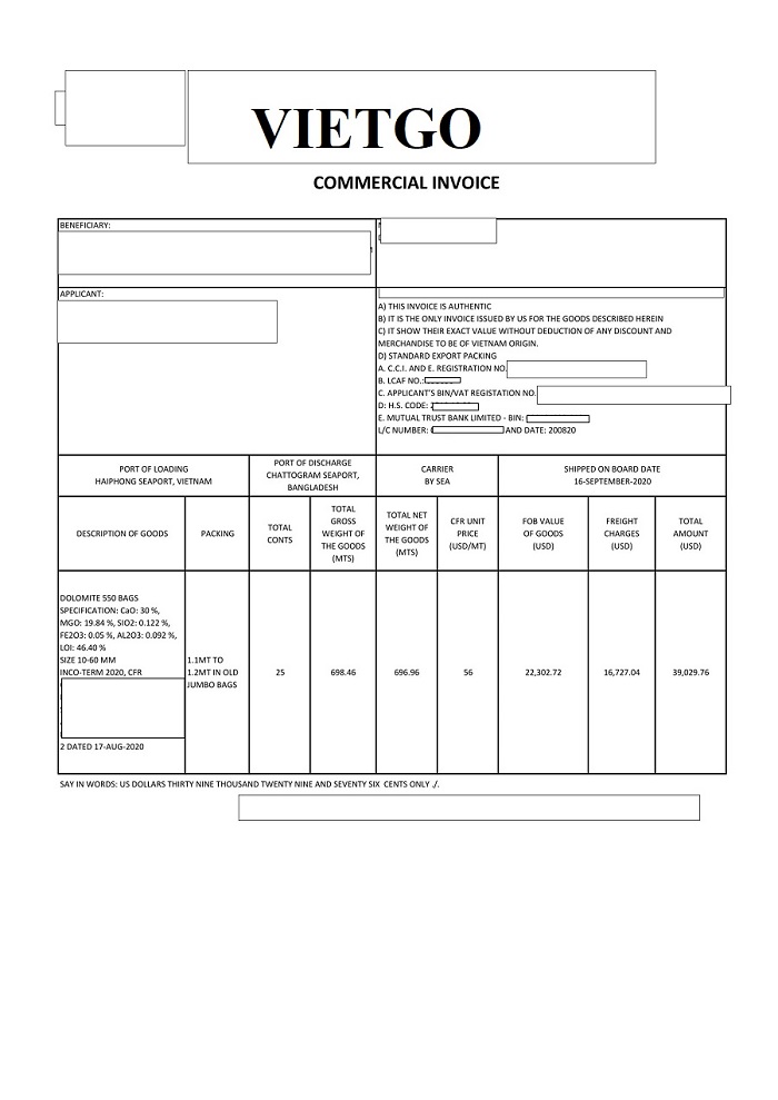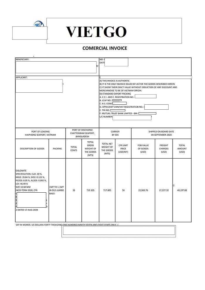 Hình ảnh hóa đơn thương mại cho lô hàng nhập dolomite vào ngày 16 tháng 09 năm 2020