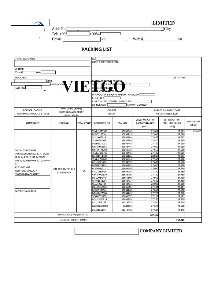 Hình ảnh phiếu đóng gói cho lô hàng nhập dolomite vào ngày 04 tháng 09 năm 2020