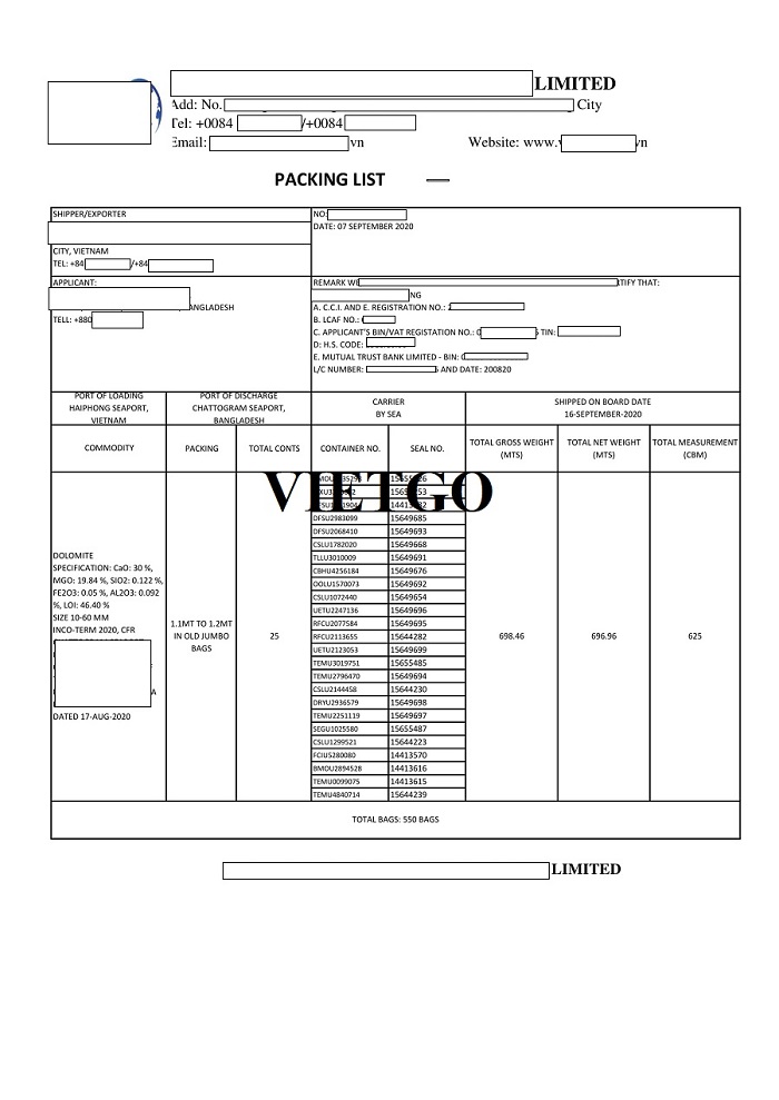 Hình ảnh phiếu đóng gói cho lô hàng nhập dolomite vào ngày 16 tháng 09 năm 2020