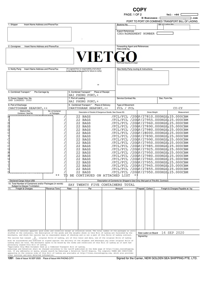 Hình ảnh vận đơn nhập khẩu dolomite từ Việt Nam vào ngày 16 tháng 09 năm 2020