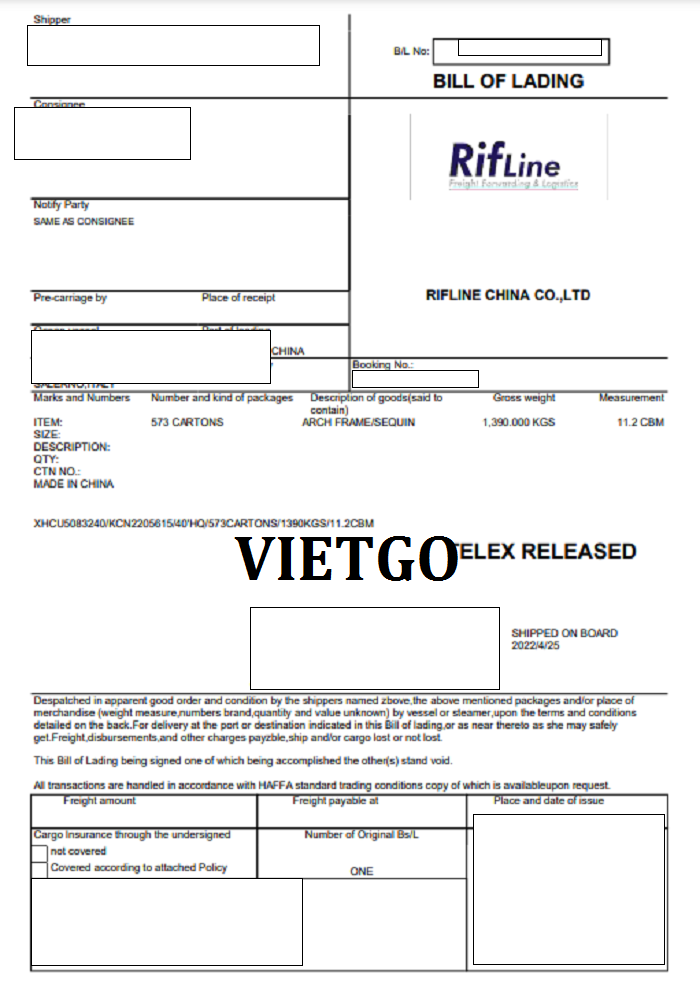 Hình ảnh vận đơn nhập khẩu các sản phẩm nội thất và đồ trang trí từ thị trường Trung Quốc do vị khách hàng cung cấp
