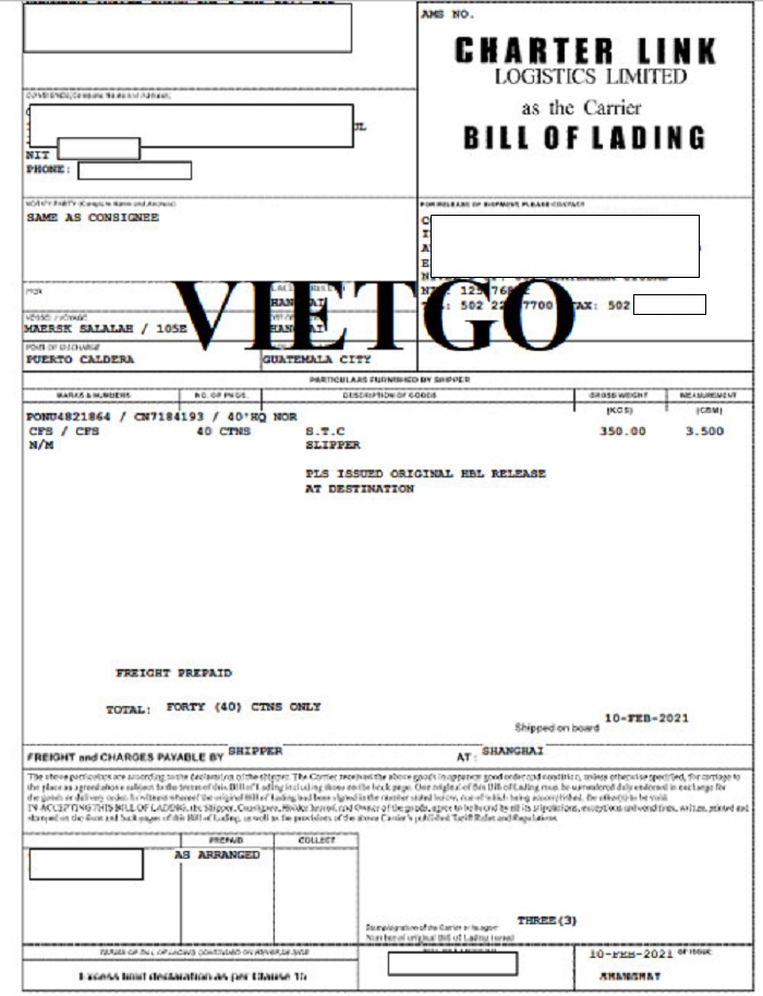 Vận đơn nhập khẩu sản phẩm Slipper từ Trung Quốc đến Guatemala ngày 10/02/2021 do vị khách hàng cung cấp