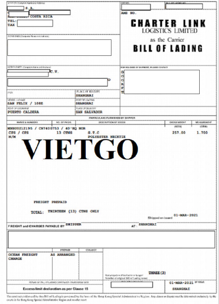 Vận đơn nhập khẩu sản phẩm cà vạt từ Trung Quốc đến San Salvador ngày 01/03/2021 do vị khách hàng cung cấp