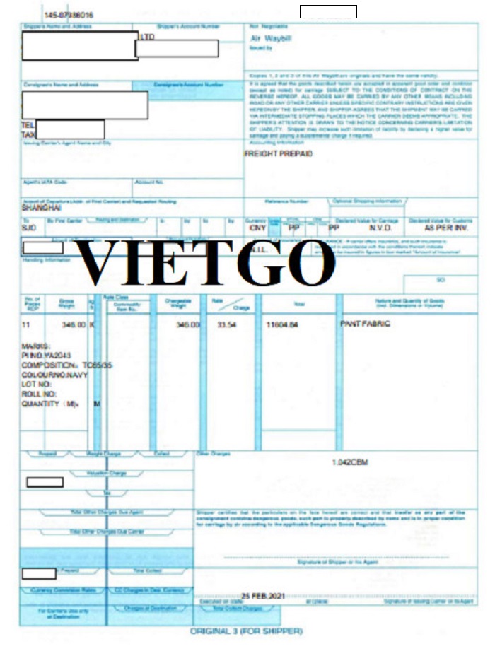 Vận đơn nhập khẩu sản phẩm Quần vải từ Trung Quốc đến Costa Rica ngày 25/02/2021 do vị khách hàng cung cấp