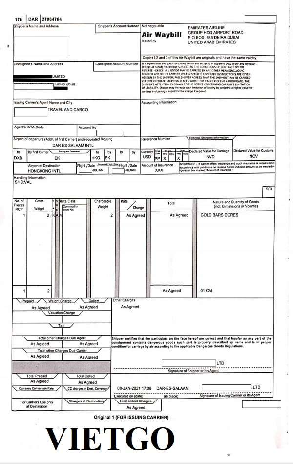 Hình ảnh vận đơn nhập khẩu vàng từ Tanzania sang Hồng Kông ngày 08/01/2021