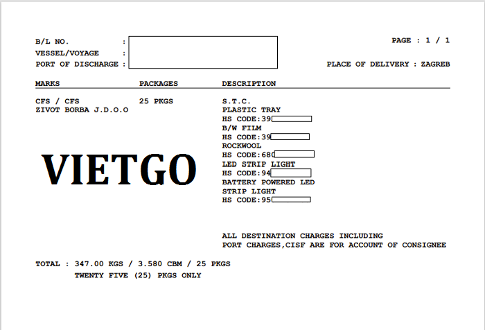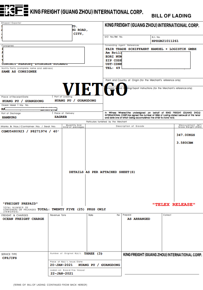 Hình ảnh vận đơn đường biển đơn hàng nhập khẩu sản phẩm gia dụng từ Trung Quốc sang Croatia do khách hàng thực hiện vào 21/01/2021