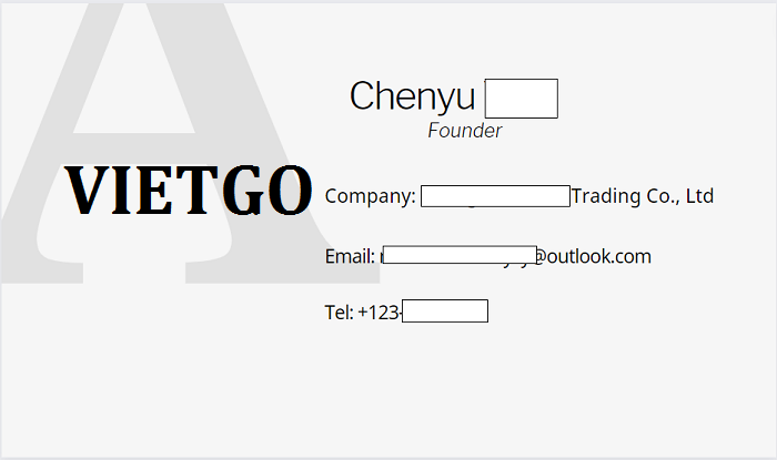 ██████████ Trading Co., Ltd là công ty chuyên xuất nhập khẩu và sản xuất các loại sản phẩm thức ăn chăn nuôi có trụ sở chính tại Trung Quốc. Trong suốt nhiều năm hoạt động, công ty đã trở thành một trong những nhà cung cấp đáng tin cậy cho nhiều công ty và trang trại chăn nuôi lớn, nhỏ trong toàn khu vực. Các sản phẩm công ty đang yêu cầu với số lượng lớn để phục vụ cho việc kinh doanh của công ty anh đó là: gạo, ngô, sắn lát và các sản phẩm chế biến từ dừa. Công ty của anh yêu cầu lượng hàng hóa với số lượng lớn vì các đơn đặt hàng đối với sản phẩm thức ăn chăn nuôi ngày một nhiều, bên cạnh đó công ty cũng đang có kế hoạch mở rộng thị trường trong thời gian sắp tới để tiếp cận với các trang trại ở những vùng xa xôi một cách dễ dàng và thuận tiện hơn.