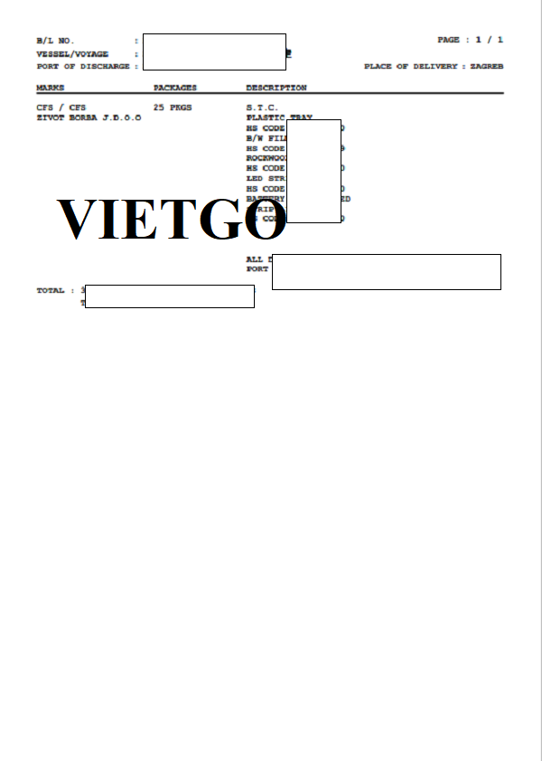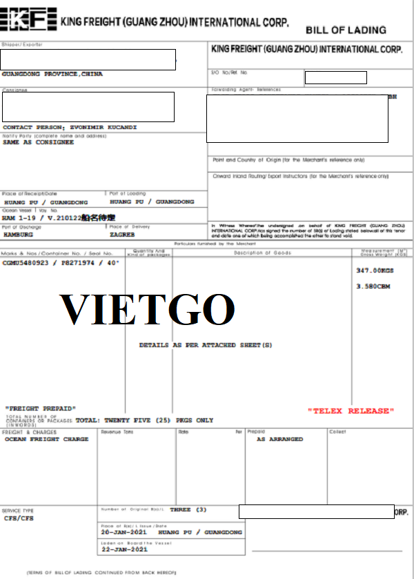 Hình ảnh vận đơn đường biển đơn hàng nhập khẩu sản phẩm gia dụng từ Trung Quốc sang Croatia do khách hàng thực hiện vào 21/01/2021