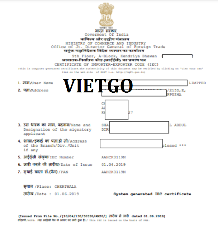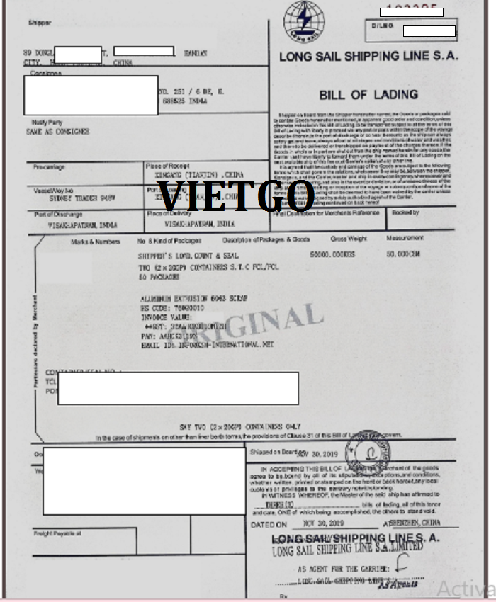 Dưới đây là hình ảnh bản vận đơn nhập khẩu vật liệu xây dựng từ Trung Quốc sang Ấn Độ mà công ty đã thực hiện thành công vào ngày 30/11/2019: