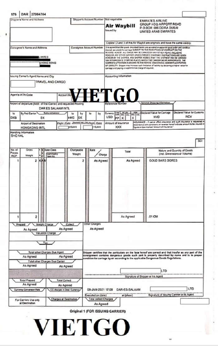 Hình ảnh vận đơn nhập khẩu vàng từ Tanzania sang Hồng Kông ngày 08/01/2021
