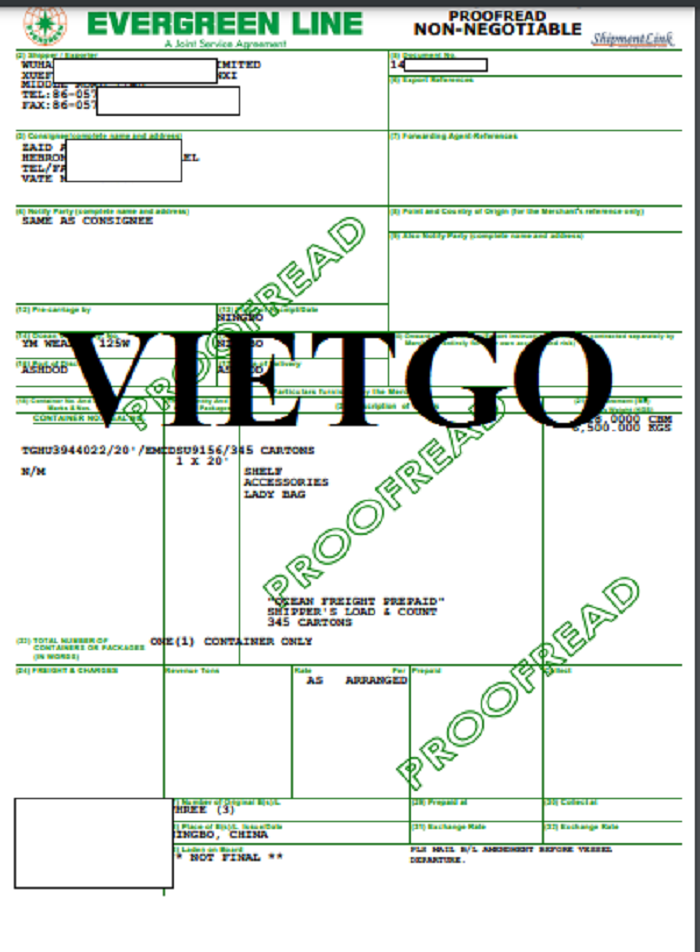 Dưới đây là hình ảnh bản vận đơn nhập khẩu túi xách và phụ kiện từ Ninh Ba – Trung Quốc sang Israel mà vị khách hàng đã nhập khẩu thành công trước đó: