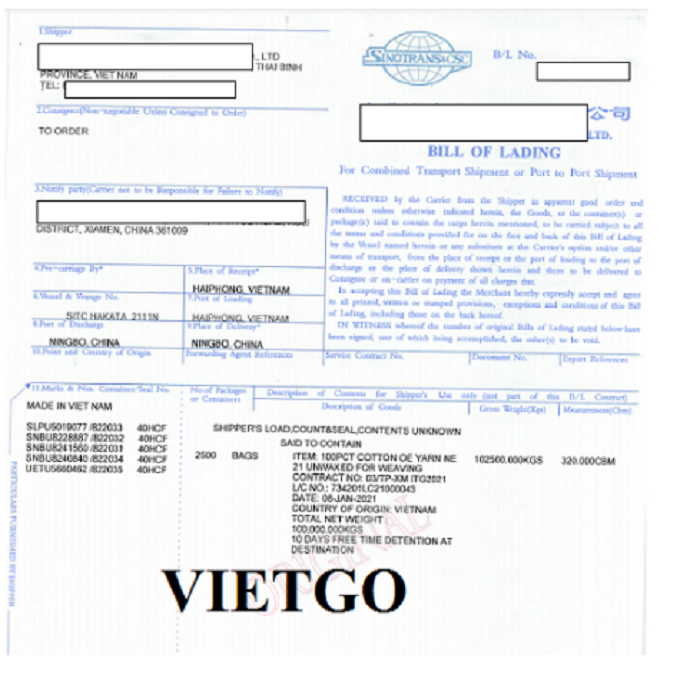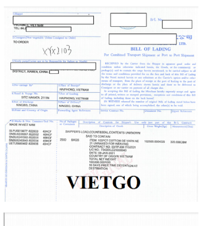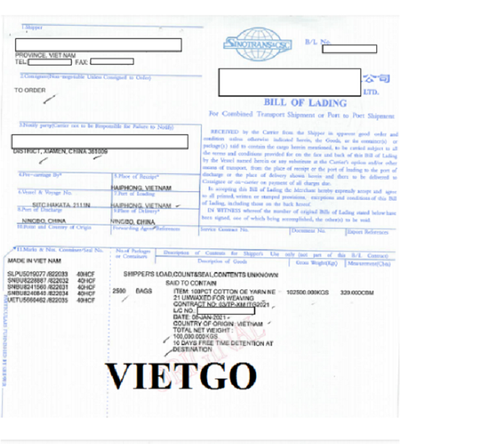 Bộ chứng từ nhập khẩu sản phẩm sợi cotton từ Hải Phòng, Việt Nam sang Ningbo, Trung Quốc vào ngày 27/03/2021 mới đây do vị khách hàng cung cấp