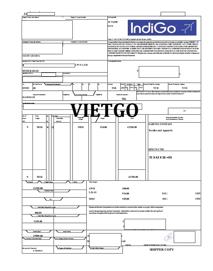 Hình ảnh vận đơn nhập khẩu sản phẩm vải may mặc và quần áo từ Ấn Độ của công ty vị khách hàng