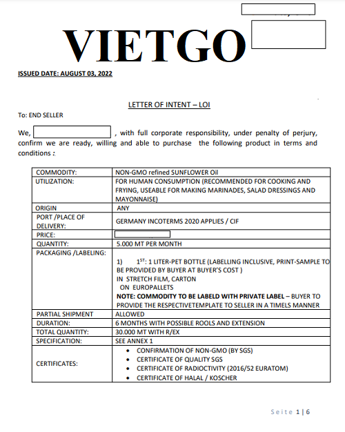 Thông tin chi tiết về sản phẩm dầu hướng dương xin được gửi đến Quý doanh nghiệp như sau: