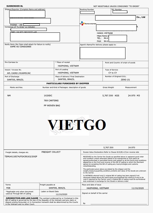 Dưới đây là hình ảnh một vận đơn đường biển (Bill of Lading) của một chuyến hàng nhập khẩu thành công túi PP dệt từ Việt Nam sang Brazil.