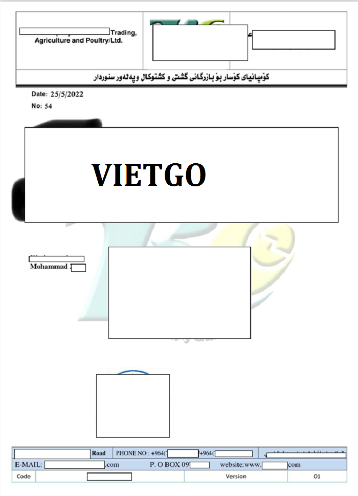 Ông Mohammad hiện đang giữ vị trí Quản lý tại công ty ██████████ for ██████████ and ██████████/Ltd có văn phòng nằm tại trục đường chính giữa hai thành phố lớn Erbil và Mosul, Iraq. Liên hệ trực tiếp với VIETGO, ông Mohammad có đề xuất đơn hàng nhập khẩu sản phẩm đậu nành với số lượng 500 tấn cho mỗi lần. Đơn hàng này được ông thực hiện nhằm mục đích chế biến thức ăn chăn nuôi, phục vụ hoạt động sản xuất kinh doanh của công ty ông.