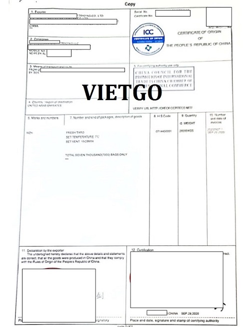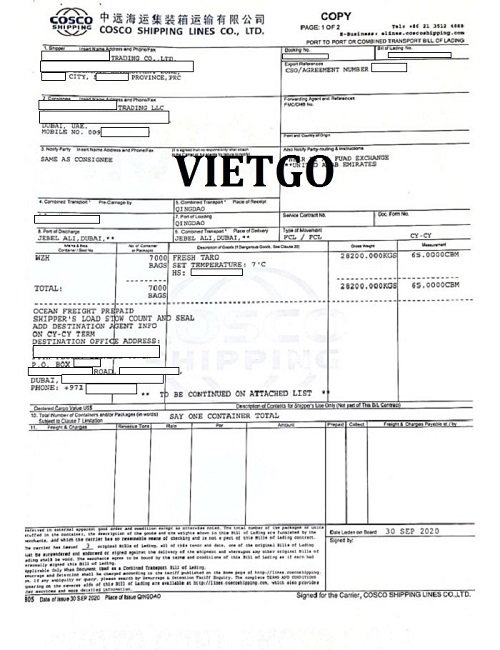 Dưới đây là bản vận đơn nhập khẩu và một số giấy tờ liên quan cho sản phẩm khoai sọ tươi từ Thanh Đảo, Trung Quốc vào ngày 30/09/2020 do công ty vị khách hàng từng thực hiện thành công: