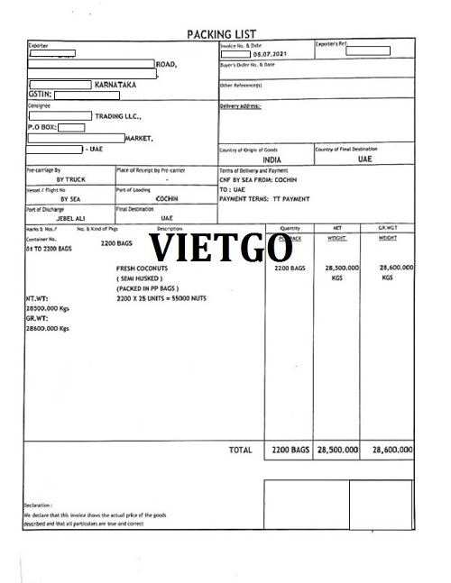 Hình ảnh phiếu đóng gói hàng hóa do vị khách hàng cung cấp