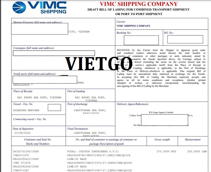 Hình ảnh vận đơn nhập khẩu từ Việt Nam sang Bangladesh