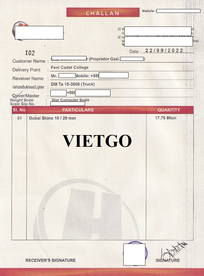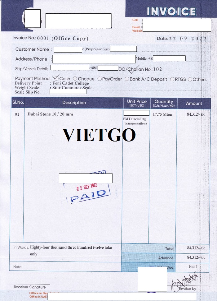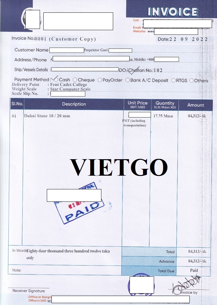 Hình ảnh một số hóa đơn nhập khẩu đá xây dựng của công ty vị khách hàng
