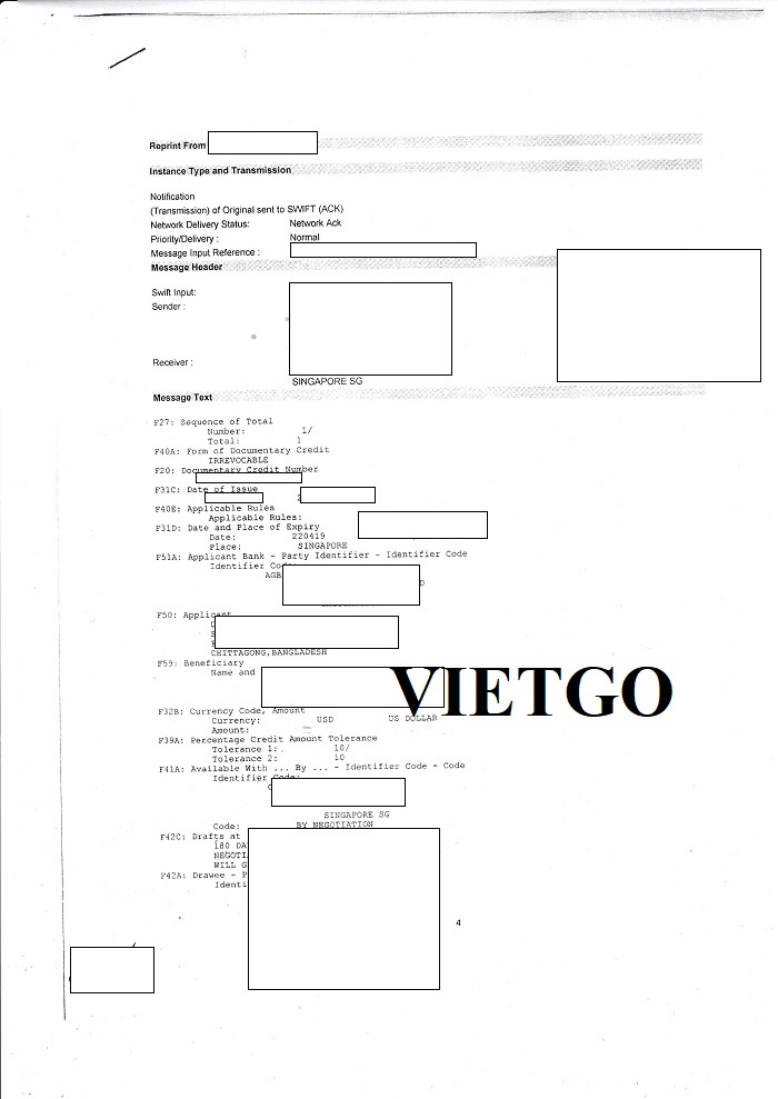 Hình ảnh bản sao LC từ giao dịch trước đây của công ty vị khách hàng