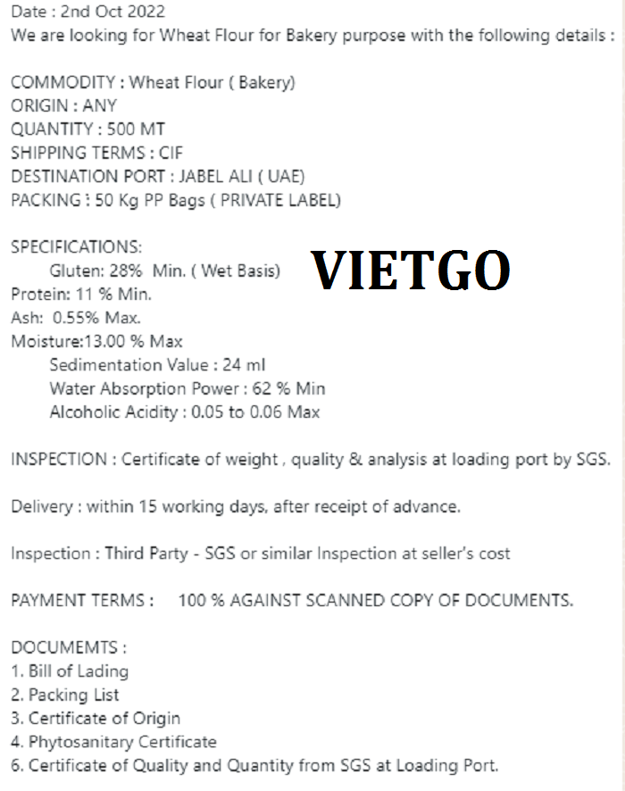 Chia sẻ về đơn hàng bột mì với VIETGO, ông Amit cho biết: “Hiện tại, công ty chúng tôi đang có nhu cầu nhập khẩu bột mì đến thị trường UAE để tiêu thụ. Chúng tôi dự định nhập khẩu thử 500 tấn cho chuyến hàng đầu tiên để xem xét nhu cầu tiêu thụ tại thị trường này. Nếu sản phẩm đạt được kỳ vọng, chúng tôi sẽ tiến hành nhập khẩu thường xuyên hàng tháng với số lượng lớn hơn và dự định sẽ nhập khẩu trong vòng một năm. Sản phẩm cần thỏa mãn thông số kỹ thuật mà tôi đã cung cấp, đồng thời tôi cũng mong muốn nhận được bảng thông số kỹ thuật chi tiết về sản phẩm từ phía nhà cung cấp. Tôi muốn sản phẩm được đói gói trong bao PP với trọng lượng là 50kg/bao và nhận được báo giá chi tiết theo phương thức CIF đến cảng Jebel Ali, UAE. Nếu đơn hàng nhập khẩu bột mì này thành công, tôi sẽ kí kết hợp đồng với các nhà cung cấp của VIETGO cho các đơn hàng nhập khẩu các sản phẩm nông sản khác, cụ thể là dầu hướng dương và gạo”.
