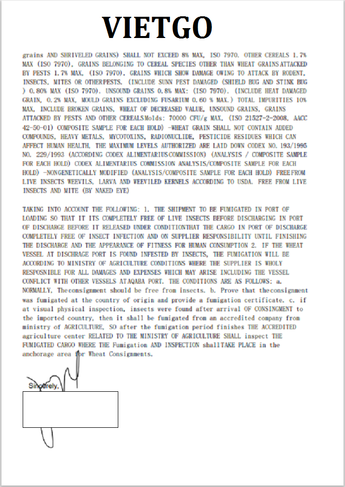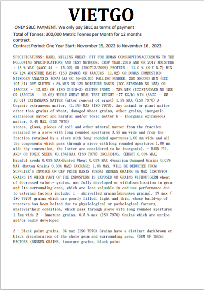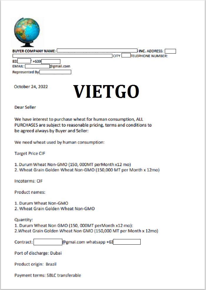 Ông John là đại diện mua hàng đến từ công ty ██████████ Trading ██████████. có văn phòng đặt tại thành phố Makati, Philippines. Liên hệ trực tiếp cùng VIETGO, ông John có đề xuất một đơn hàng nhập khẩu sản phẩm lúa mì với số lượng 150.000 tấn cho mỗi loại hàng tháng tới thị trường Dubai. Hợp đồng dự kiến được tiến hành hàng năm. Đơn hàng lần này được ông thực hiện nhằm mục đích phục vụ hoạt động sản xuất kinh doanh của khách hàng công ty ông.