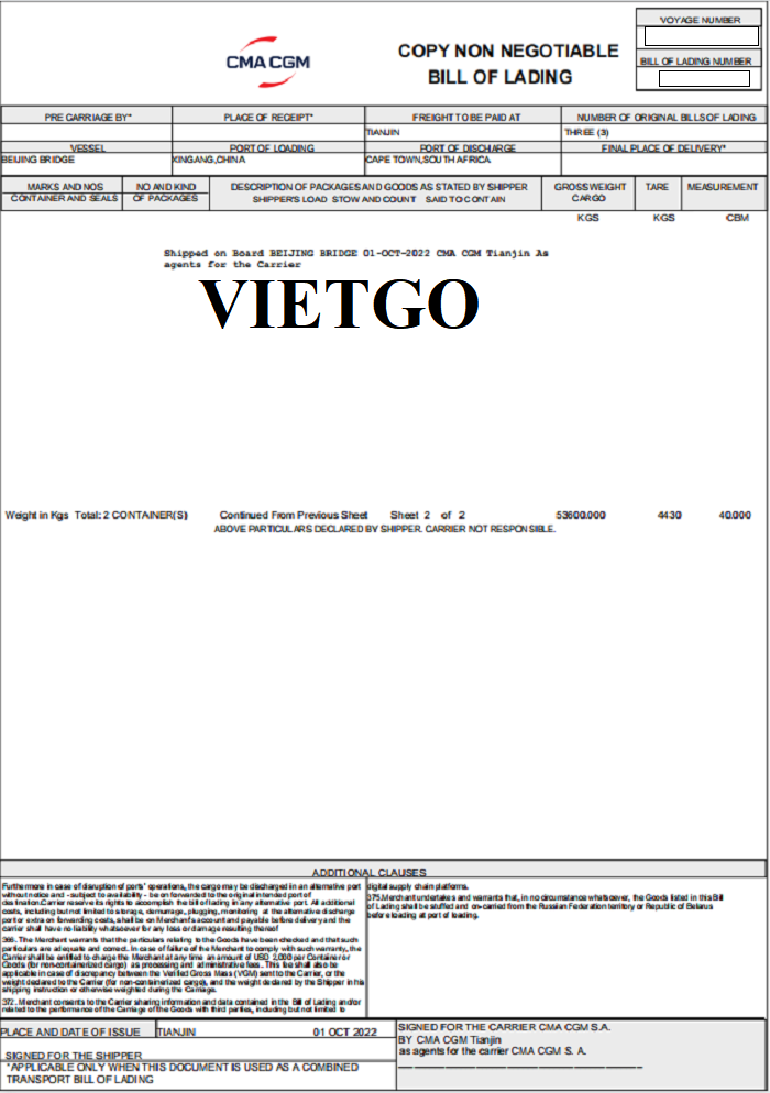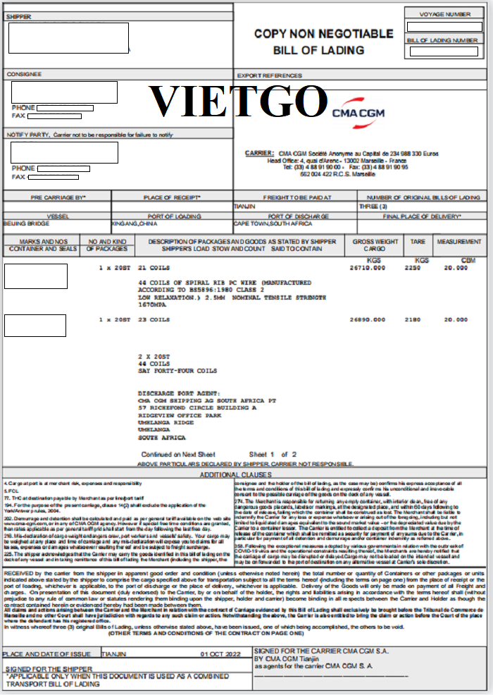 Là một vị thương nhân dày dặn và nhanh nhạy trong các thương vụ giao thương trong nước và quốc tế, ông Heerden đã từng xuất – nhập khẩu hàng hóa qua nhiều quốc gia trên thế giới. Dưới đây là bản vận đơn đường biển nhập khẩu sản phẩm dây thép từ thị trường Trung Quốc do công ty ông Heerden đã thực hiện thành công vào ngày 01/10/2022: