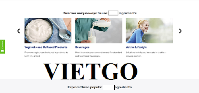 Các sản phẩm từ sữa như bột sữa, đạm whey, bột bơ sữa của thương hiệu ██████████ được nhập khẩu và phân phối tại thị trường Việt Nam, Lào, Campuchia là nguồn nguyên liệu tuyệt vời cho các sản phẩm bổ sung dinh dưỡng (chất đạm – protein từ sữa động vật) cho người. Các sản phẩm nguyên liệu của ██████████ được ứng dụng rộng rãi trong ngành công nghiệp thực phẩm như sản xuất bánh, kẹo, sữa và thức uống, thanh bổ sung protein.