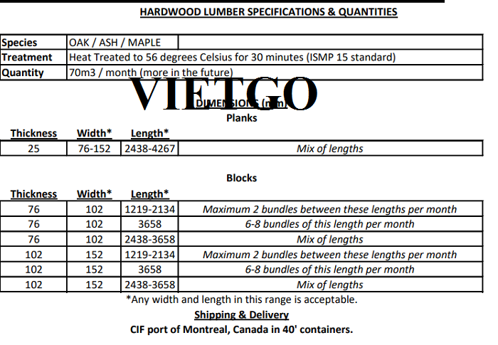 Hiện tại công ty đang có nhu cầu tìm kiếm sản phẩm gỗ keo xẻ với số lượng lớn xuất khẩu sang Canada cho dự án kinh doanh của mình. Ông Barone rất hân hạnh khi biết đến VIETGO, đối tác làm ăn với nhiều nhà cung cấp tiềm năng cho các sản phẩm gỗ. Khách hàng mong muốn hợp tác lâu dài với nhà cung cấp có khả năng cung cấp sản phẩm theo yêu cầu của công ty.