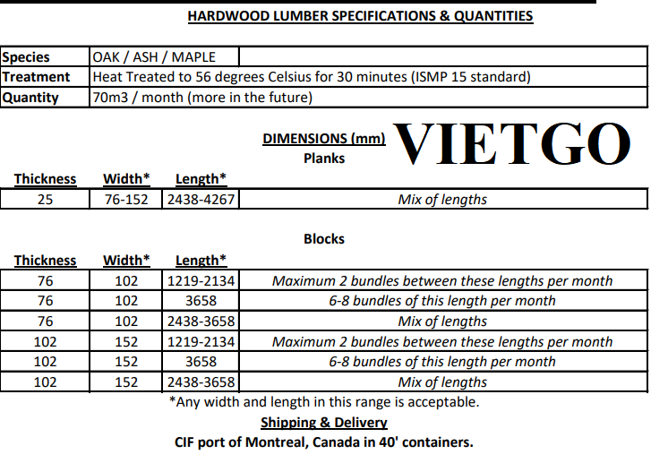 Số lượng: 70 m3/tháng cho 2 loại (đóng trong container 40ft)