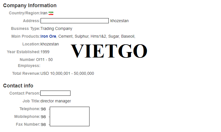 ██████████ Co là một công ty thương mại phát triển đã có kinh nghiệm hoạt động tại thị trường Iran từ năm 1999. Đây là nhà cung cấp, nhà nhập khẩu được công nhận cho các sản phẩm vật liệu xây dựng như xi măng, đá tự nhiên, đá cẩm thạch, đá hoa cương, các sản phẩm nông sản như gạo, đường và một số sản phẩm lọc dầu, vật liệu khoan barit và hóa chất.