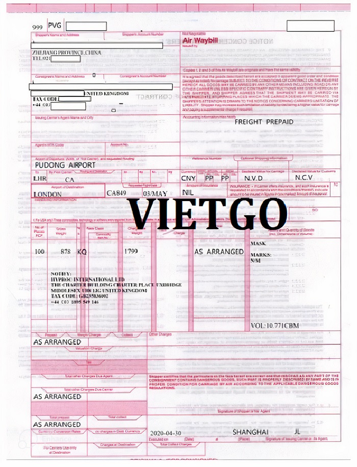 Dưới đây là bản vận đơn nhập khẩu mặt hàng khẩu trang từ Trung Quốc tới thị trường Anh Quốc vào ngày 30/4/2020 của công ty vị khách hàng.
