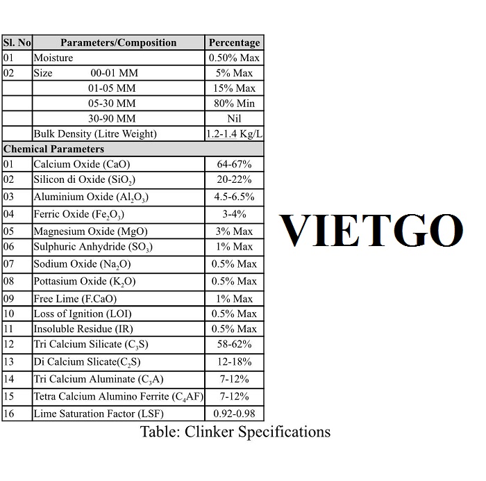 Nắm bắt được điều đó, công ty chúng tôi hiện đang cần tìm nguồn cung clinker chất lượng với số lượng 45.000 – 50.000 tấn mỗi tháng nhằm phục vụ cho mục đích kinh doanh. Hy vọng thông qua VIETGO, tôi sẽ nhận được nhiều lời chào hàng hấp dẫn”.