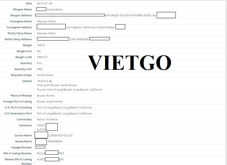 Hình ảnh vận đơn xuất khẩu vải may mặc sang thị trường Mỹ của công ty vào ngày 26/7/2013
