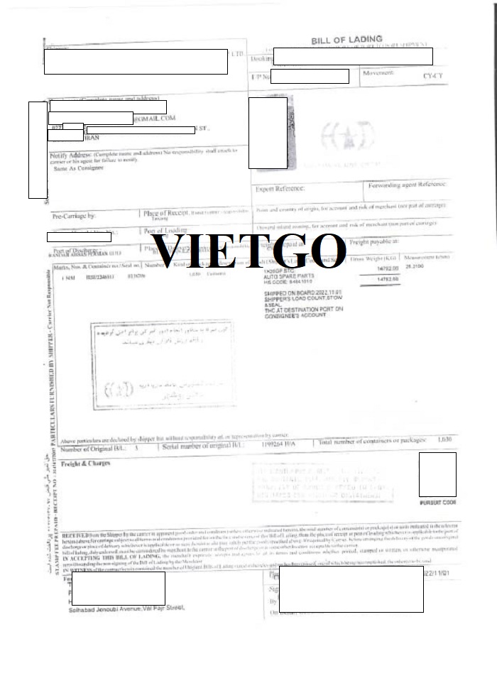 Hình ảnh vận đơn nhập khẩu sản phảm phụ tùng ô tô, máy móc của công ty vị khách hàng