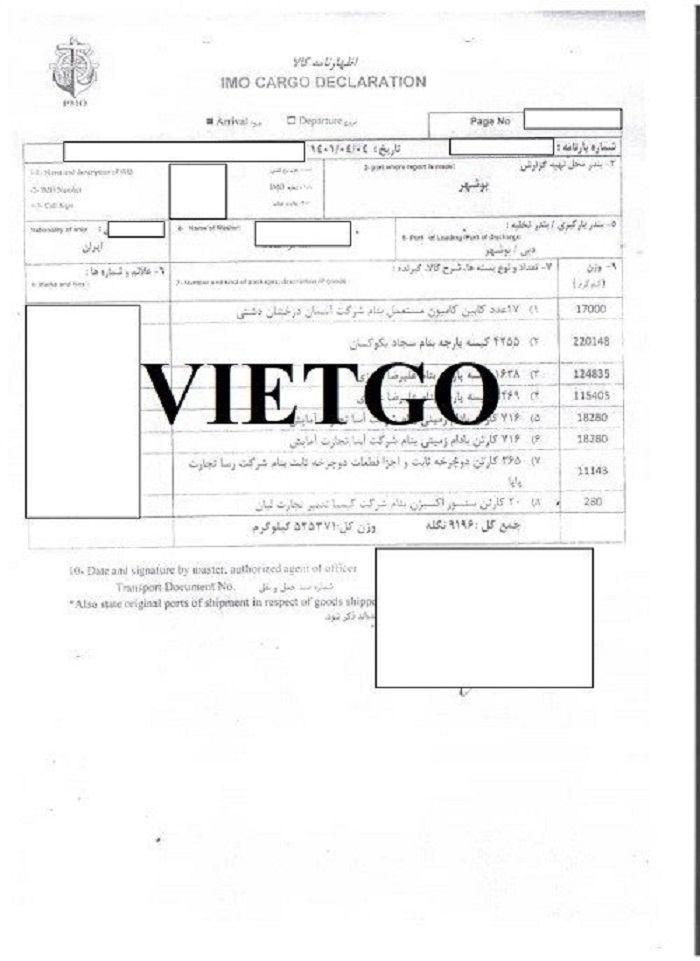 Hình ảnh giấy khai báo hàng hóa của công ty vị khách hàng