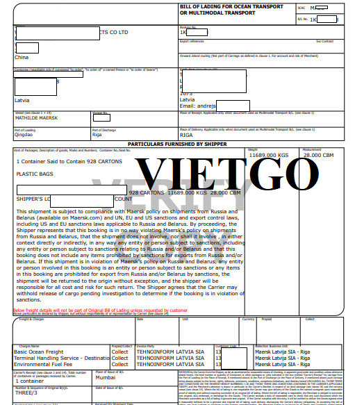 Dưới đây là bản vận đơn nhập khẩu bao bì nhựa từ Trung Quốc sang Latvia mà công ty đã nhập khẩu thành công trong thời gian vừa qua: