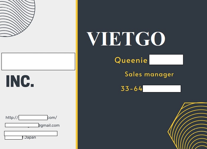 Qua quá trình làm việc, VIETGO đánh giá rằng đây là vị khách hàng nghiêm túc và có tinh thần hợp tác cao. Cô Queenie đang mong đợi nhận được báo giá và trao đổi thêm với các nhà cung cấp của VIETGO sớm nhất có thể. Vì vậy, Quý nhà cung cấp quan tâm tới đơn hàng và có mong muốn hợp tác với vị khách hàng xin vui lòng liên hệ với cô qua thông tin dưới đây: